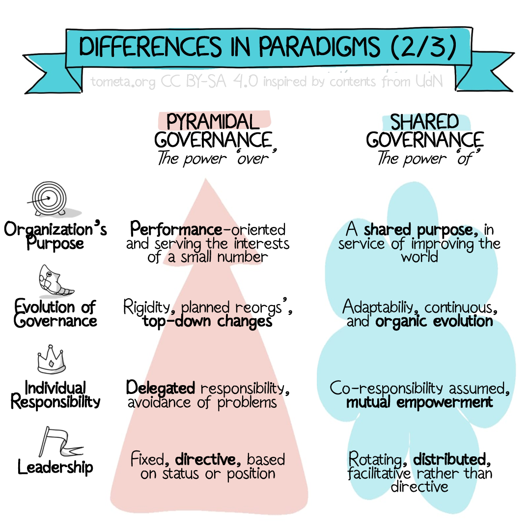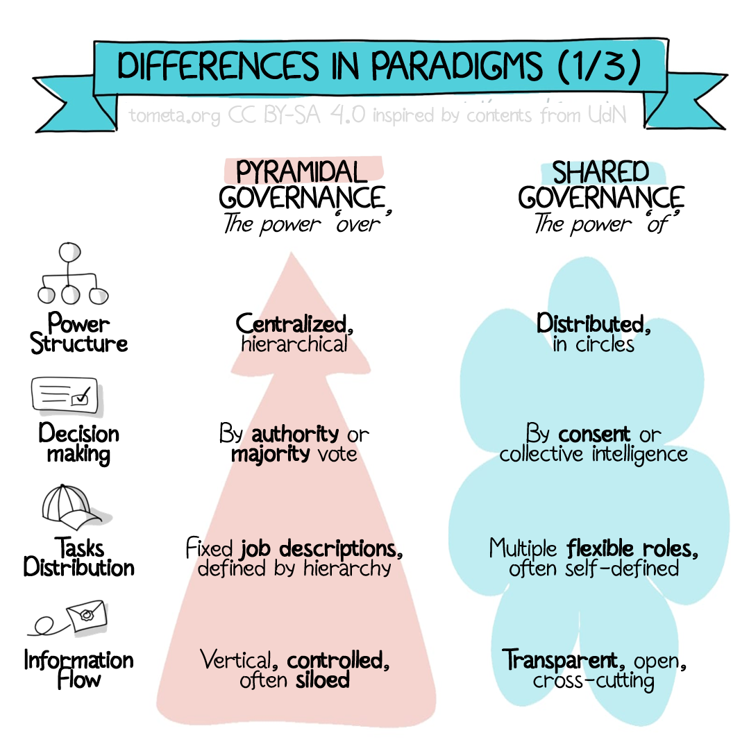 - Shared governance (distribution of power, roles and responsibilities, circles, decision-making, meeting formats)
