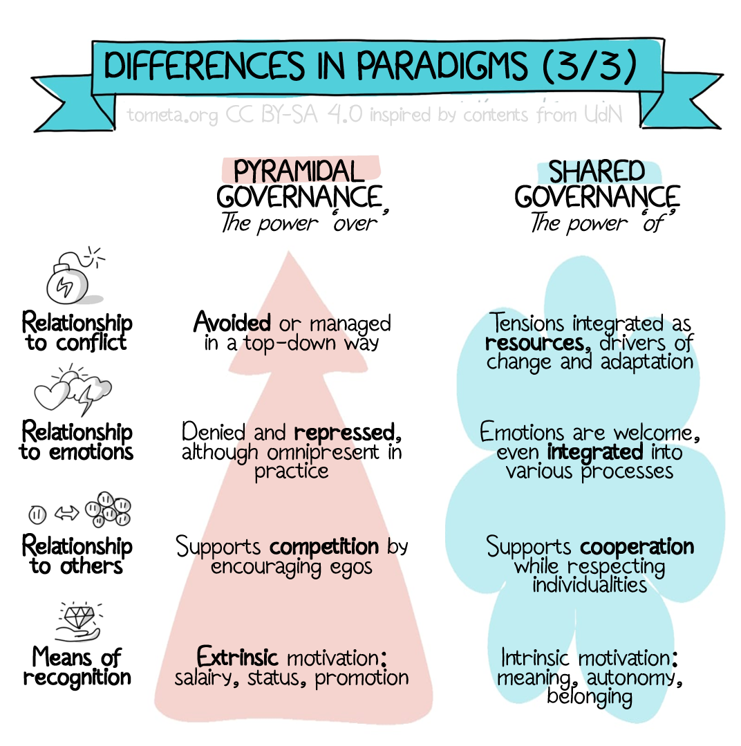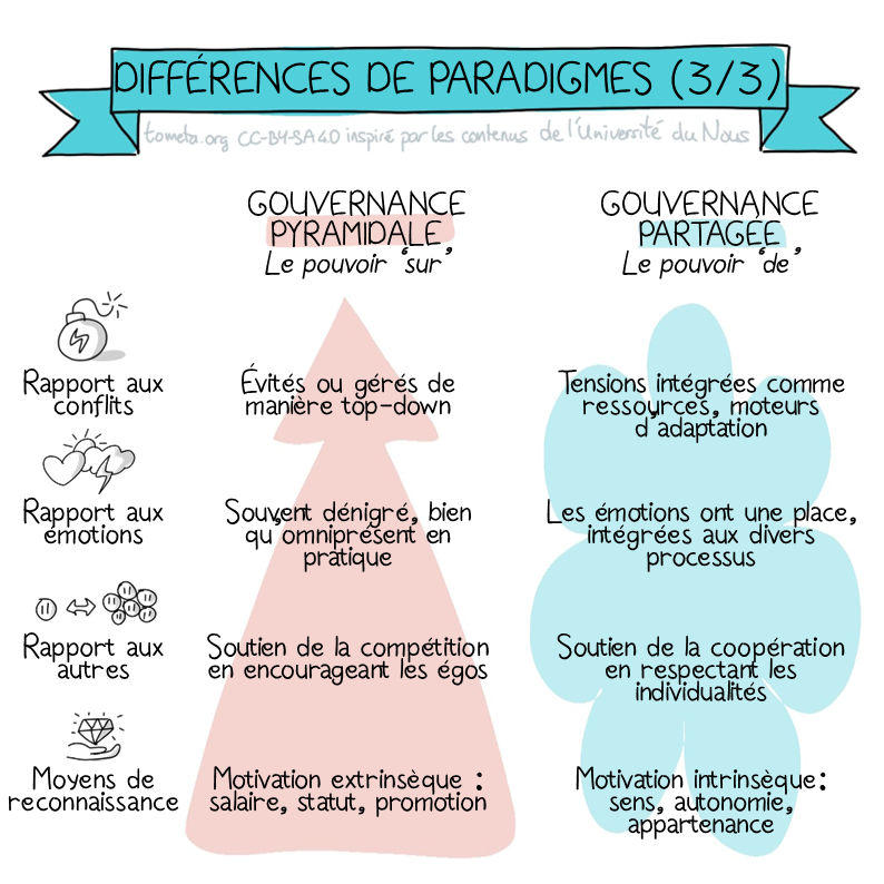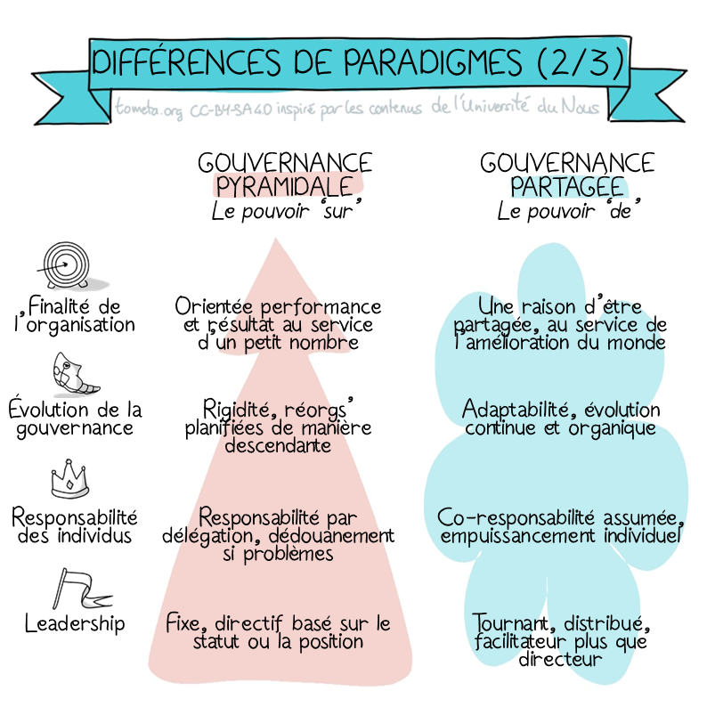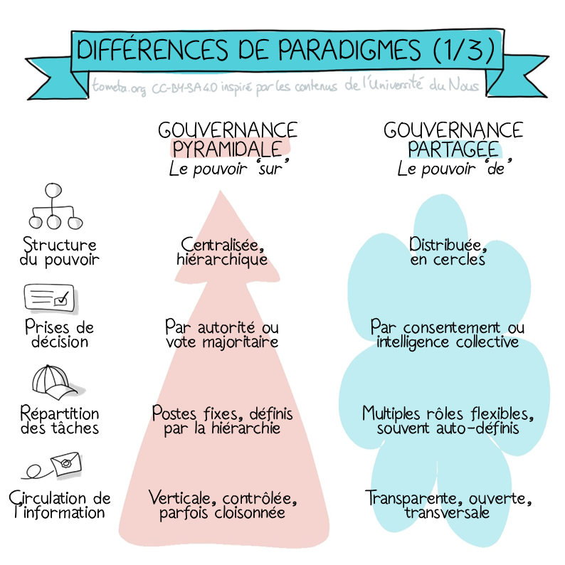 - Gouvernance partagée (répartition du pouvoir, rôles et responsabilités, cercles, prises de décisions, formats de réunions)