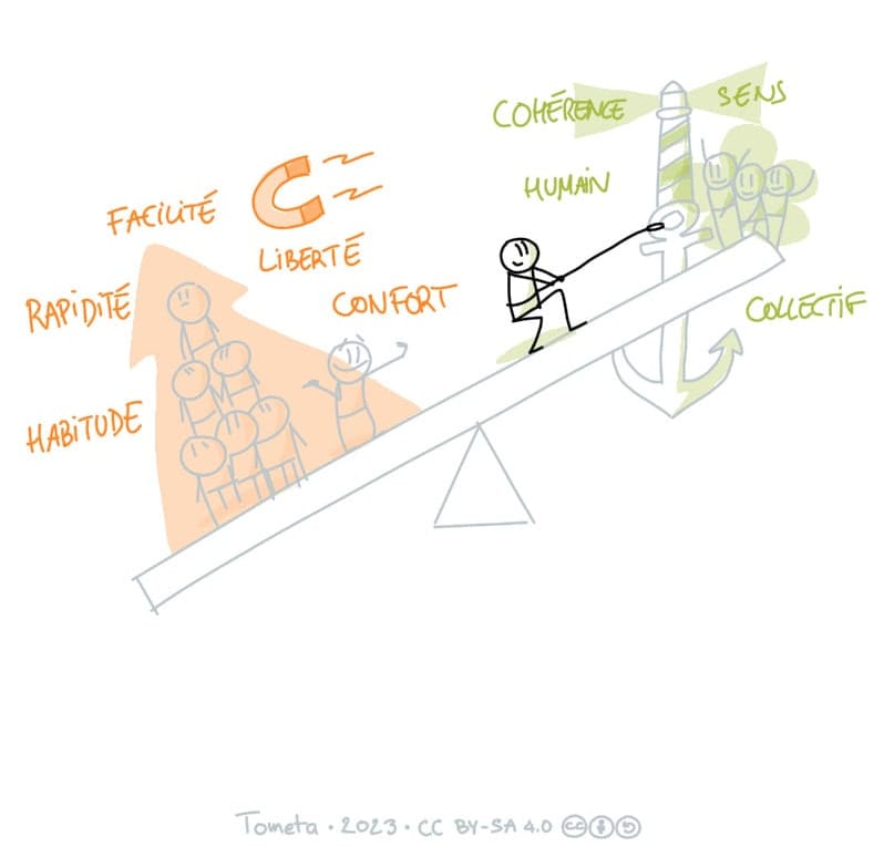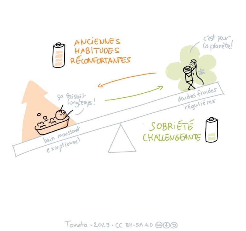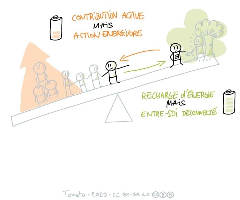 Note de vocabulaire visuel: ici les petites batteries représentent le niveau d'énergie ou de motivation des individus. Sur le dessin le personnage noir est le même qui fait des aller-retour le long de la bascule (un coup dans l'action, un coup dans la recharge)
