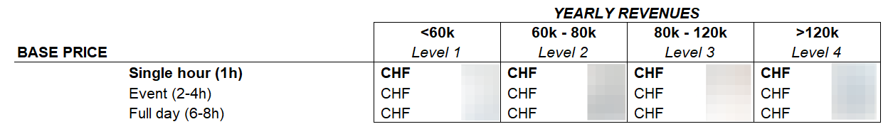 Les forfaits événement et journée sont calculés à partir du tarif horaire de base du niveau choisi, en intégrant du temps supplémentaire pour la préparation, l’installation et la charge globale de travail (qui dépasse souvent la pure durée de l'intervention). Ils sont proposés sous forme de forfaits pour plus de clarté et de simplicité.